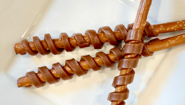 Two Caramel Pretzel Rods - Crunchy pretzel rods wrapped with our hand-crafted caramel, dipped in chocolate.